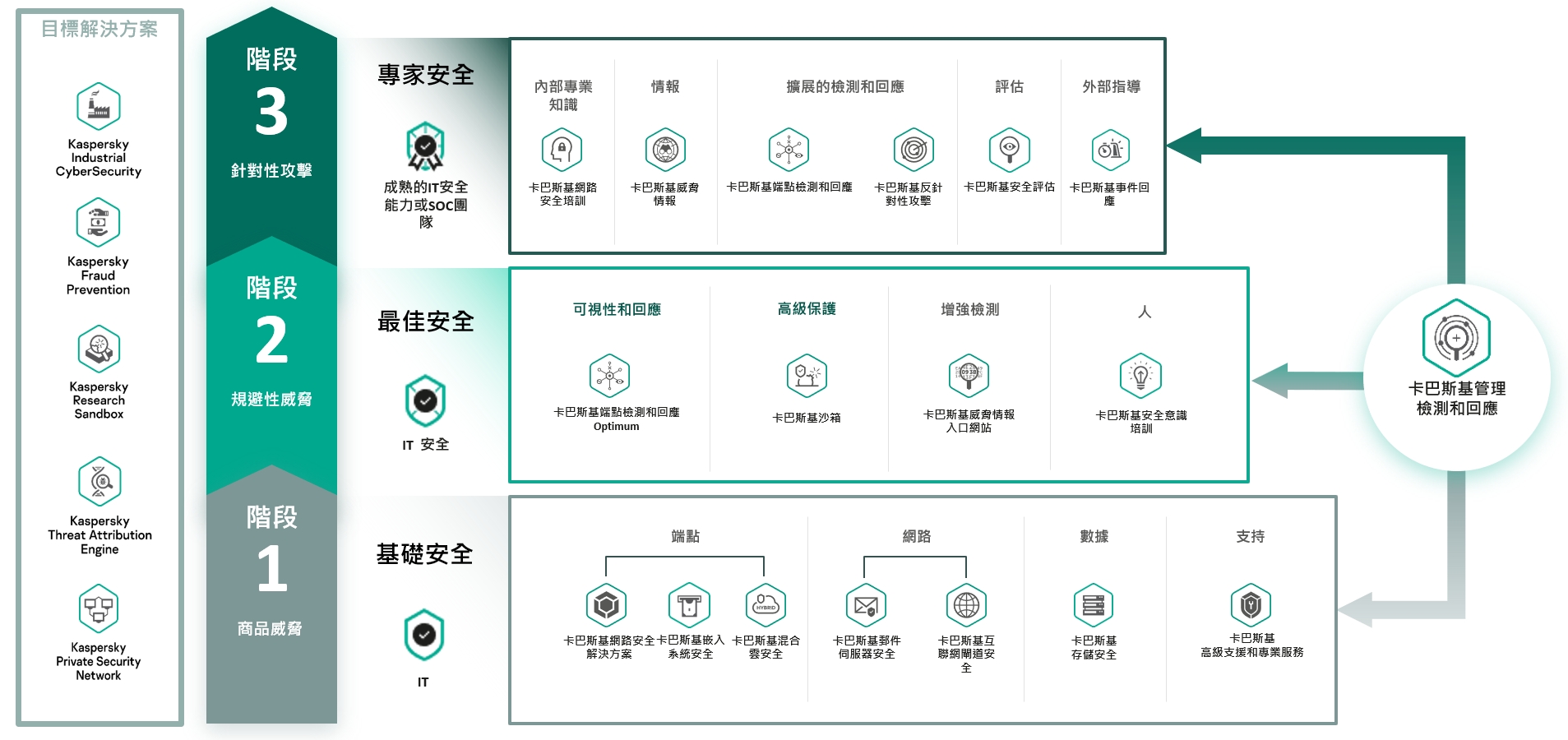 專為中Kaspersky Anti Targeted Attack Platform(KATA)可協助您成為IT安全成熟的企業組織,可以不需要額外IT安全資源的情況下,建立可防止企業受到APT等威脅和針對性攻擊影響, 以及支援法務遵循的可靠防護。有了可以充分利用自動化與徹底提高結果品質的整解決方案,即可快速辦識、調查與回應複雜的事件,進而提高您IT安全或SOC團隊的效率。小型企業開發的 Kaspersky Endpoint Security Cloud(KESC)雲端管理防護平台,讓您可以從任何地方遠程管理多個端點、設備和伺服器的安全性。